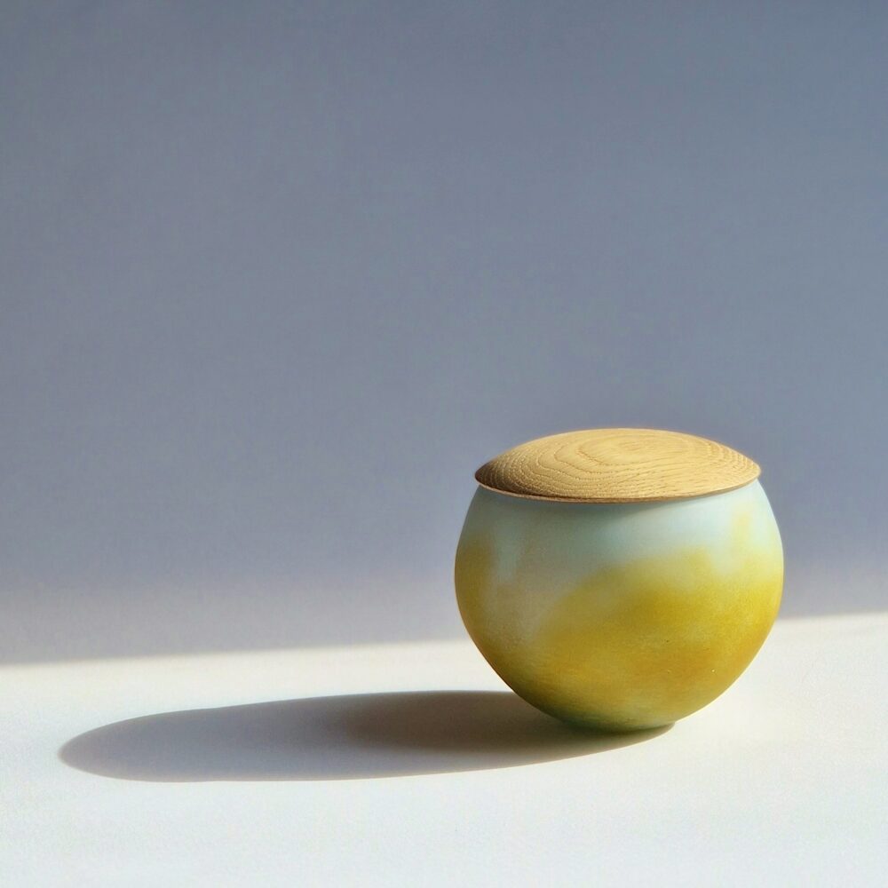 Unika krukke med egetræslåg, hvid bund med ravfarve