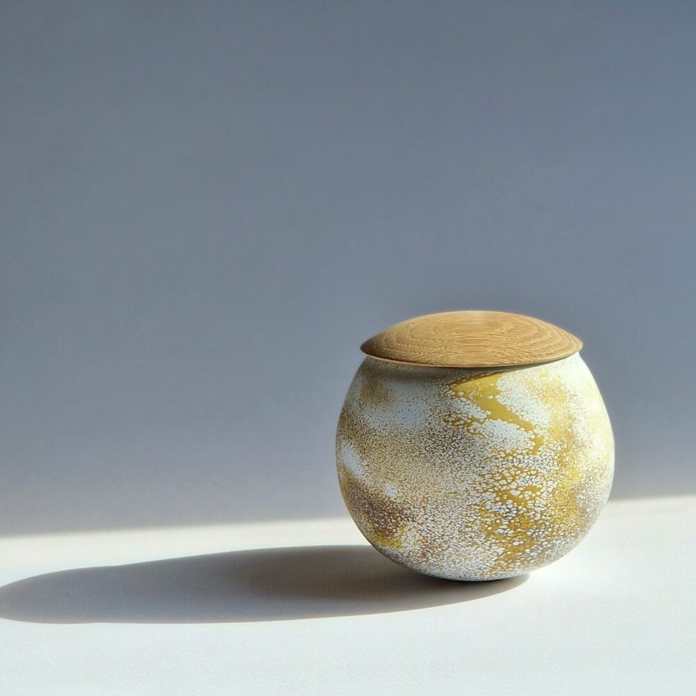 Denne krukke en sandblæst overflade i hvid og gul/grønne farver
